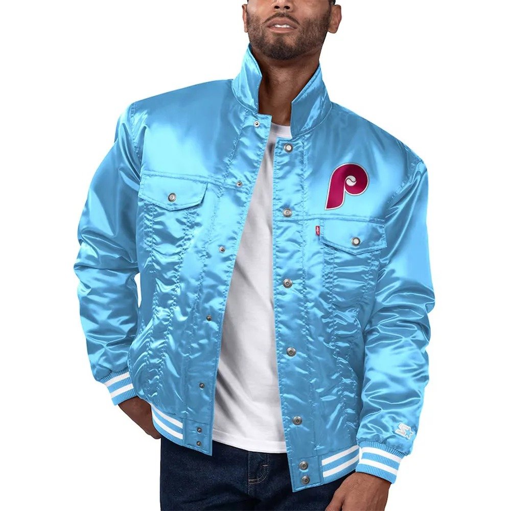 The Philadelphia Phillies Light Blue Silver Tab Trucker Jacket combines classic MLB charm with modern casual style. Its iconic Silver Tab design reflects the rich history of the Phillies while offering fans a versatile jacket for everyday wear or collectible display. A must-have for baseball enthusiasts and vintage sportswear collectors alike.